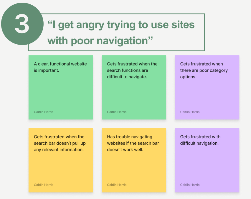 I virtually interviewed five users to gain insights on ecommerce shopping habits, preferences, and emotions. Afterwards, I wrote their insights on virtual sticky notes and organized them into groups based on commonalities.